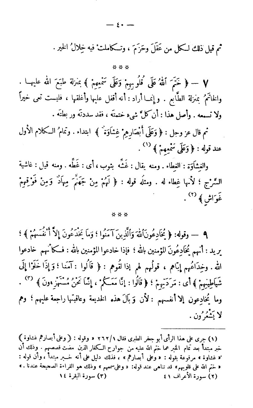 (1) جرى على هذا الرأي أبو جعفر الطبري فقال 1/262 " وقوله: (وعلى أبصارهم غشاوة) خبر مبتدأ بعد تمام الخبر عما ختم الله عليه من جوارح الكفار الذين مضت قصصهم. وذلك أن "غشاوة" مرفوعة بقوله: "وعلى أبصارهم"، فذلك دليل على أنه خير مبتدأ، وأن قوله: "ختم الله على قلوبهم" قد تناهى عند قوله: "وعلى سمعهم" وذلك هو القراءة الصحيحة عندنا".