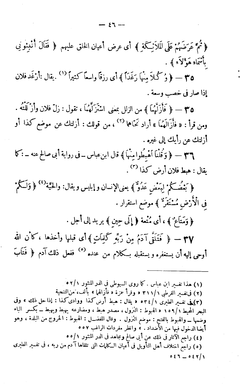 (5) راجع اختلاف أهل التأويل في أعيان الكلمات التي تلقاها آدم من ربه، في تفسير الطبري 1/542 - 546.