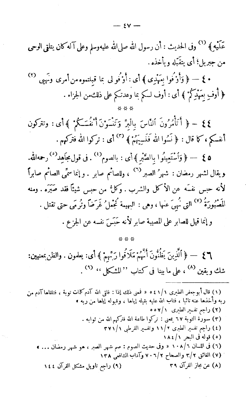 45- {وَاسْتَعِينُوا بِالصَّبْرِ} أي: بالصوم. في قول مجَاهِد (2) رحمه الله. ويقال لشهر رمضان: شهرُ الصبر (3) ، وللصائم صابر. وإنما سُمِّي الصائم صابرًا لأنه حبس نفسه عن الأكل والشرب. وكُلّ من حبس شيئًا فقد صَبَرَه. ومنه المَصْبُورةُ التي نُهِيَ عنها، وهي: البَهيمة تُجْعَلُ غَرَضًا وتُرْمَى حتى تقتل.