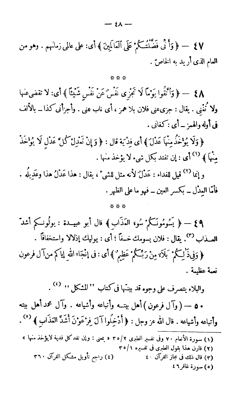 47- {وَأَنِّي فَضَّلْتُكُمْ عَلَى الْعَالَمِينَ} أي: على عالمي زمانهم. وهو من العام الذي أريد به الخاصّ.