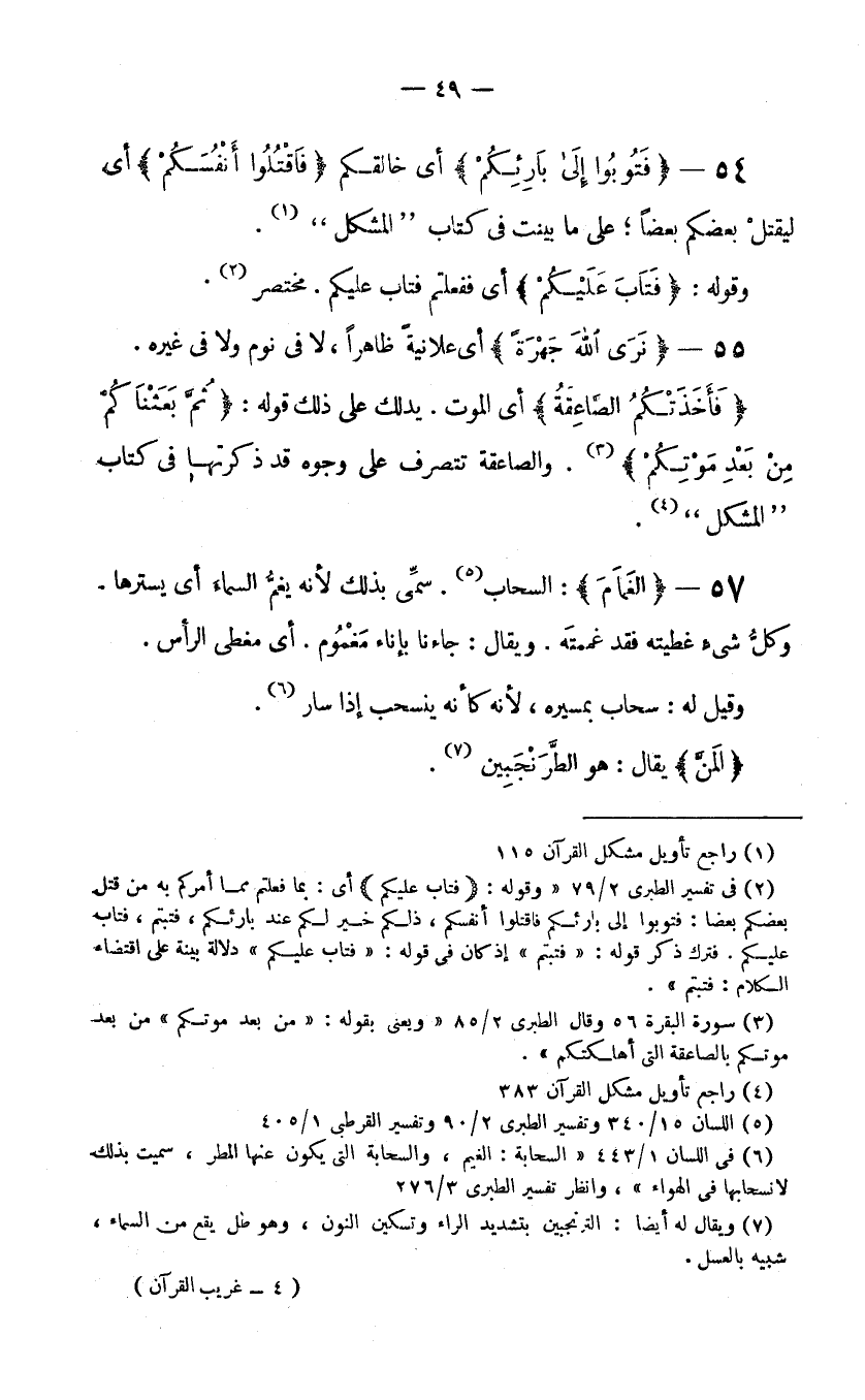 (2) في تفسير الطبري 2/79 "وقوله: (فتاب عليكم) أي: بما فعلتم مما أمركم به من قتل بعضكم بعضا: فتوبوا إلى بارئكم فاقتلوا أنفسكم، ذلكم خير لكم عند بارئكم، فتبتم، فتاب عليكم. فترك ذكر قوله: "فتبتم" إذ كان في قوله: "فتاب عليكم" دلالة بينة على اقتضاء الكلام: فتبتم".