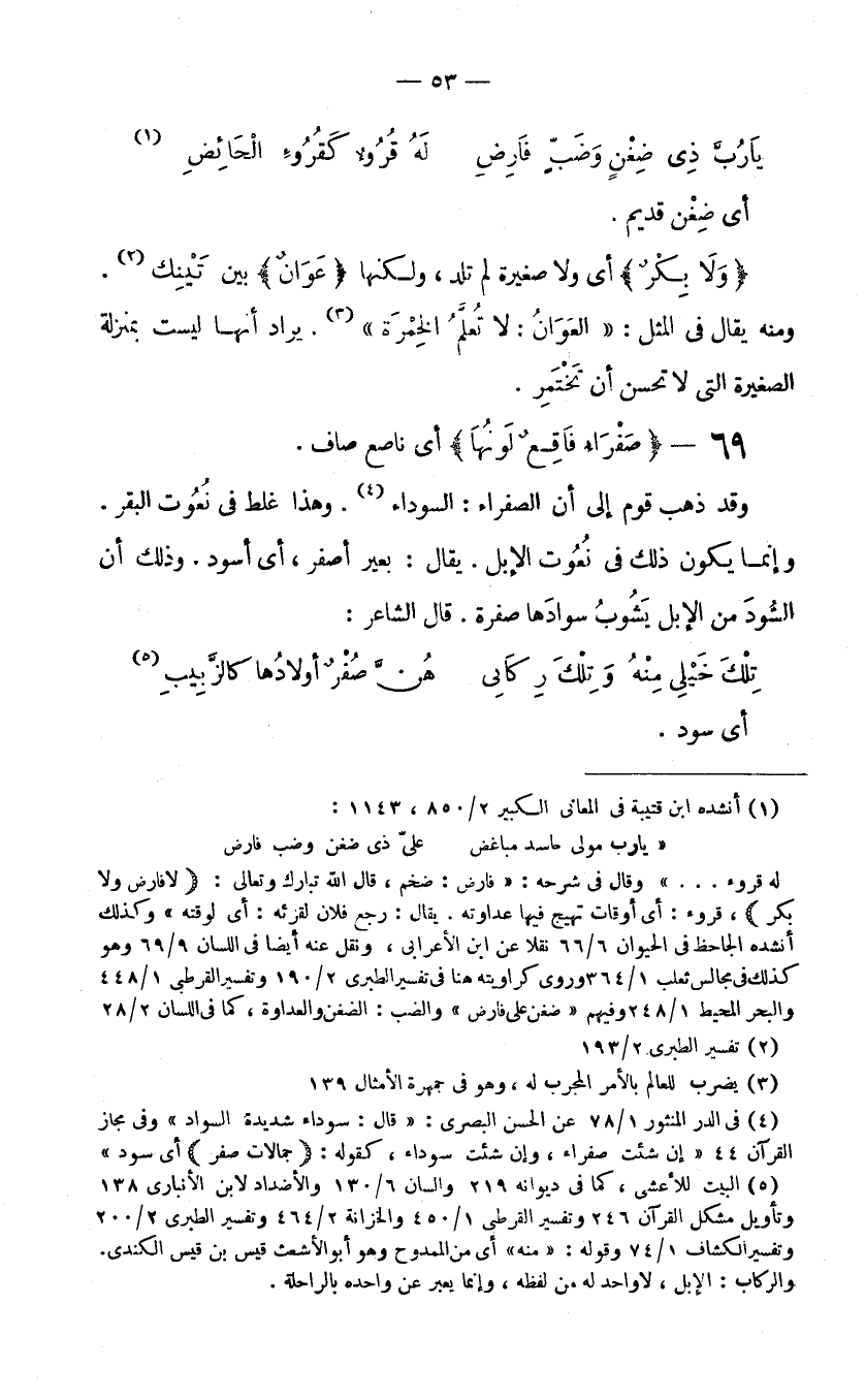 (3) في الدر المنثور 1/78 عن الحسن البصري:"قال: سوداء شديدة السواد" وفي مجاز القرآن 44 "إن شئت صفراء، وإن شئت سوداء، كقوله: (جمالات صفر) أي سود".
