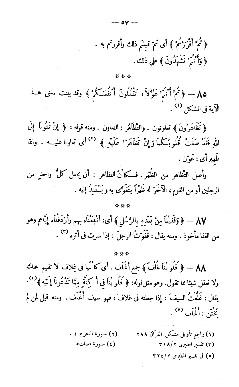 85- {ثُمَّ أَنْتُمْ هَؤُلاءِ تَقْتُلُونَ أَنْفُسَكُمْ} وقد بينت معنى هذه الآية في المشكل (1) .