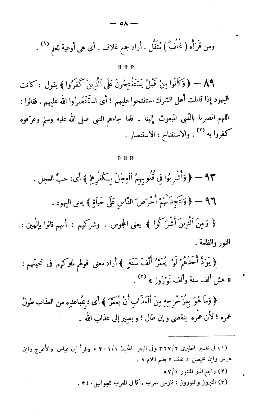 {يَوَدُّ أَحَدُهُمْ لَوْ يُعَمَّرُ أَلْفَ سَنَةٍ} أراد معنى قولهم لملوكهم في تحيتهم: "عش ألف سنة وألف نَوْرُوز" (2) .