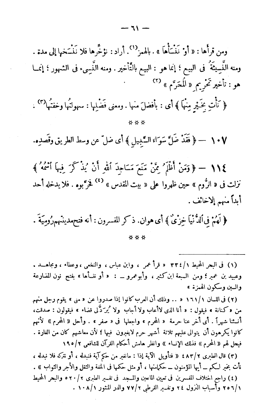 (3) قال الطبري 2/483 "فتأويل الآية إذًا: ما نغير من حكم آية فنبدله، أو نتركه فلا نبدله، نأت بخير لكم - أيها المؤمنون - حكما منها، أو مثل حكمها في الخفة والثقل والأجر والثواب".