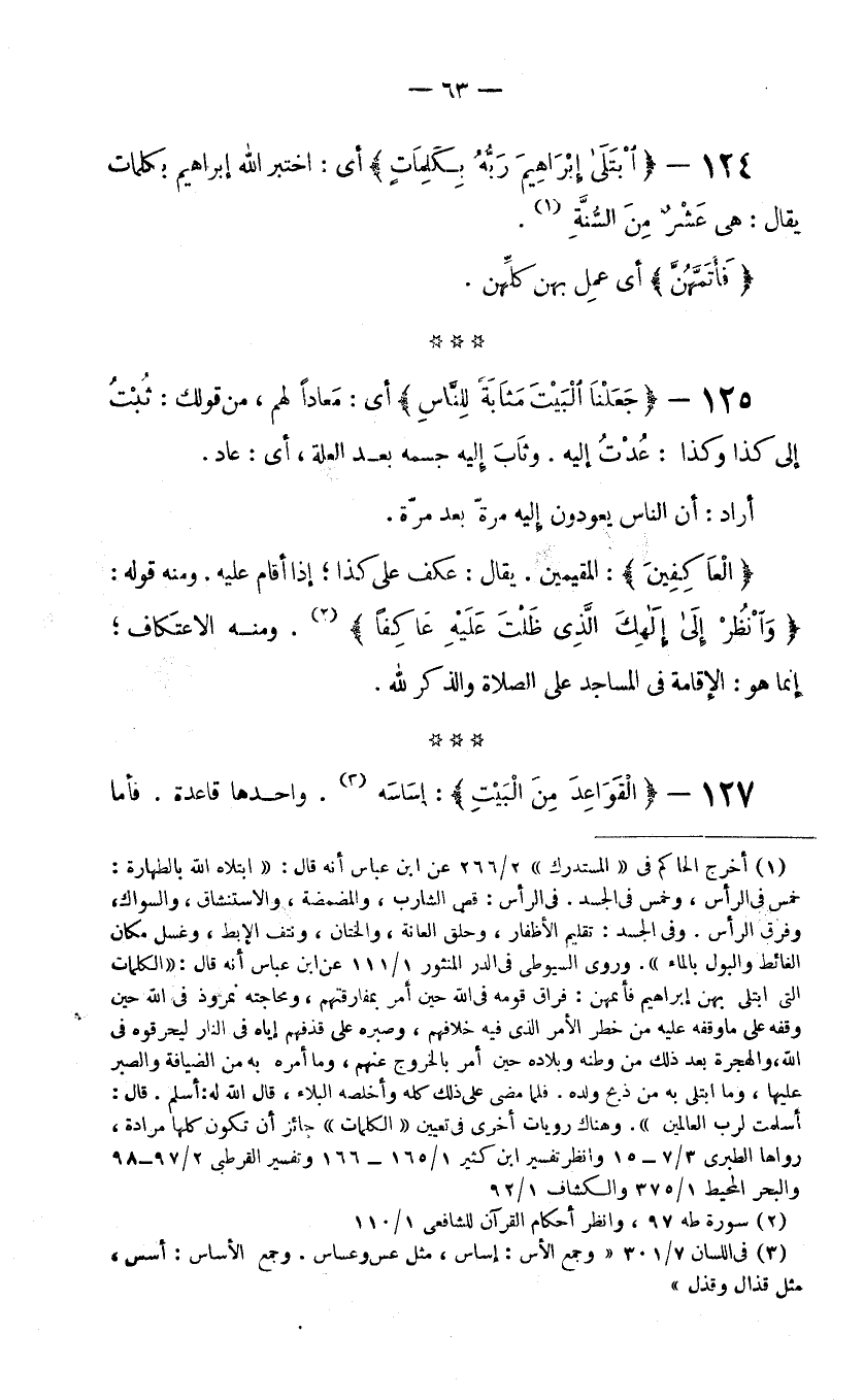 (1) أخرج الحاكم في "المستدرك" 2/266 عن ابن عباس أنه قال: " ابتلاه الله بالطهارة: خمس في الرأس، وخمس في الجسد. في الرأس: قص الشارب، والمضمضة، والاستنشاق، والسواك، وفرق الرأس. وفي الجسد: تقليم الأظفار، وحلق العانة، والختان، ونتف الإبط، وغسل مكان الغائط والبول بالماء". وروى السيوطي في الدر المنثور 1/111 عن ابن عباس أنه قال: "الكلمات التي ابتلي بهن إبراهيم فأتمهن: فراق قومه في الله حين أمر بمفارقتهم، ومحاجته نمروذ في الله حين وقفه على ما وقفه عليه من خطر الأمر الذي فيه خلافهم، وصبره على قذفهم إياه في النار ليحرقوه في الله، والهجرة بعد ذلك من وطنه وبلاده حين أمر بالخروج عنهم، وما أمره به من الضيافة والصبر عليها، وما ابتلي به من ذبح ولده. فلما مضى على ذلك كله وأخلصه البلاء، قال الله له: أسلم. قال: أسلمت لرب العالمين". وهناك رويات أخرى في تعيين "الكلمات" جائز أن تكون كلها مرادة، رواها الطبري 3/7-15 وانظر تفسير ابن كثير 1/165 - 166 وتفسير القرطبي 2/97 - 98 والبحر المحيط 1/375 والكشاف 1/92.