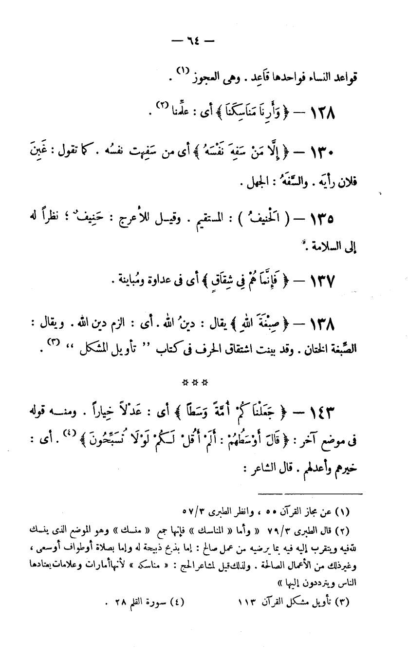135- (الحَنيفُ) : المستقيم. وقيل للأعرج: حَنِيفٌ؛ نظرًا له إلى السلامة.