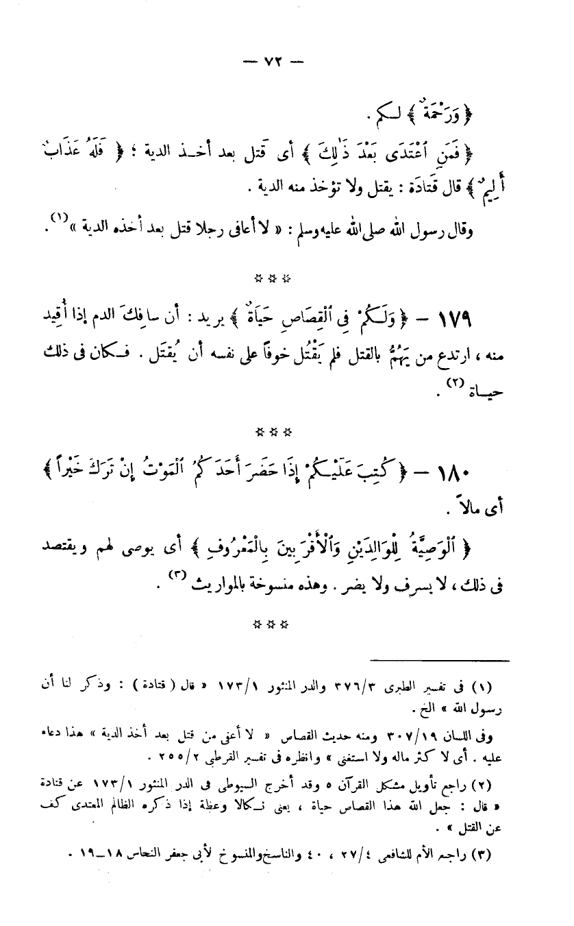 (2) راجع تأويل مشكل القرآن 5 وقد أخرج السيوطي في الدر المنثور 1/173 عن قتادة "قال: جعل الله هذا القصاص حياة، يعني نكالا وعظة إذا ذكره الظالم المعتدي كف عن القتل".