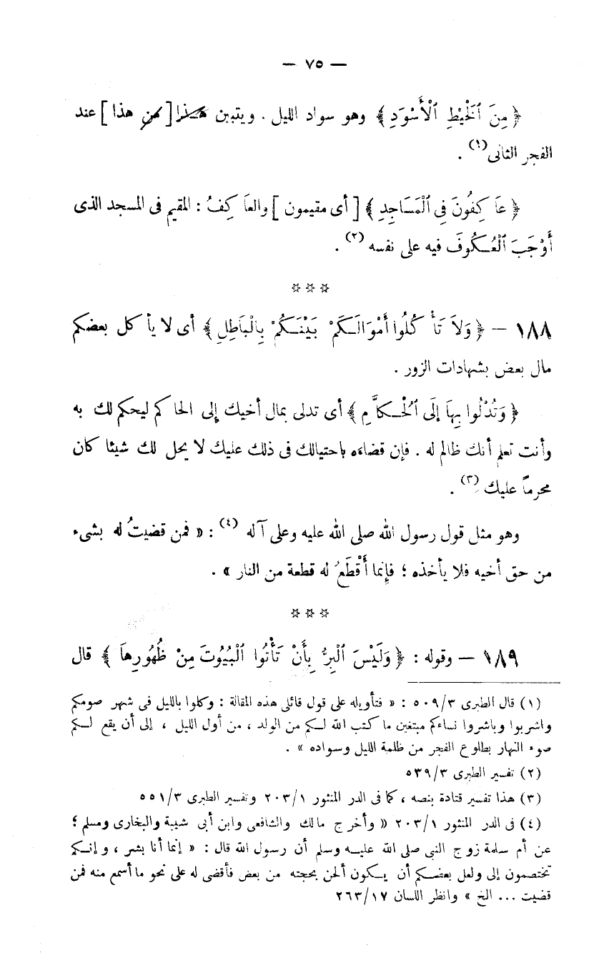 (1) قال الطبري 3/509: "فتأويله على قول قائلي هذه المقالة: وكلوا بالليل في شهر صومكم واشربوا وباشروا نساءكم مبتغين ما كتب الله لكم من الولد، من أول الليل، إلى أن يقع لكم ضوء النهار بطلوع الفجر من ظلمة الليل وسواده".