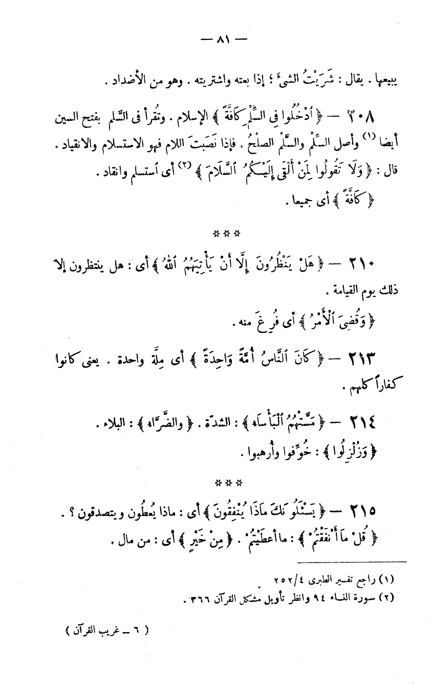 208- {ادْخُلُوا فِي السِّلْمِ كَافَّةً} الإسلام. وتُقرأ في السَّلم بفتح السين أيضا (1) وأصل السِّلْم والسَّلْم الصلح. فإذا نصبت اللام فهو الاستسلام والانقياد. قال: {وَلا تَقُولُوا لِمَنْ أَلْقَى إِلَيْكُمُ السَّلامَ} (2) أي استسلم وانقاد.