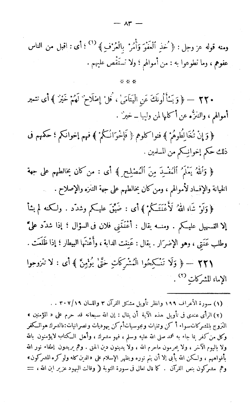 (2) الرأي عندي في تأويل هذه الآية أن يقال: إن الله سبحانه قد حرم على "المؤمنين" التزوج بالمشركات سواء أكن وثنيات ومجوسيات أم كن يهوديات ونصرانيات: قالشرك هو الكفر وكل من كفر بما جاء به محمد صلى الله عليه وسلم، فهو مشرك، وأهل الكتاب لا يؤمنون بالله ولا باليوم الآخر، ولا يحرمون ما حرم الله، ولا يدينون دين الحق. وهم يريدون إطفاء نور الله بأفواههم، ولكن الله يأبى إلا أن يتم نوره ويظهر الإسلام على "الدين كله ولو كره المشركون" وهم مشركون بنص القرآن. كما قال تعالى في سورة التوبة (وقالت اليهود عزير ابن الله وقالت النصارى المسيح ابن الله ذلك قولهم بأفوههم يضاهئون قول الذين كفروا من قبل قاتلهم الله أنى يؤفكون اتخذوا أحبارهم ورهبانهم أربابا من دون الله والمسيح ابن مريم وما أمروا إلا ليعبدوا إلها واحدا لا إله إلا هو سبحانه عما يشركون) . وأما إباحة التزوج بالحرائر اليهوديات والنصرانيات فقد جاءت به آية أخرى من أواخر ما نزل من القرآن، وهي قوله تعالى في سورة المائدة: (اليوم أحل لكم الطيبات وطعام الذين أوتوا الكتاب حل لكم وطعامكم حل لهم والمحصنات من المؤمنات والمحصنات من الذين أوتوا الكتاب من قبلكم) .