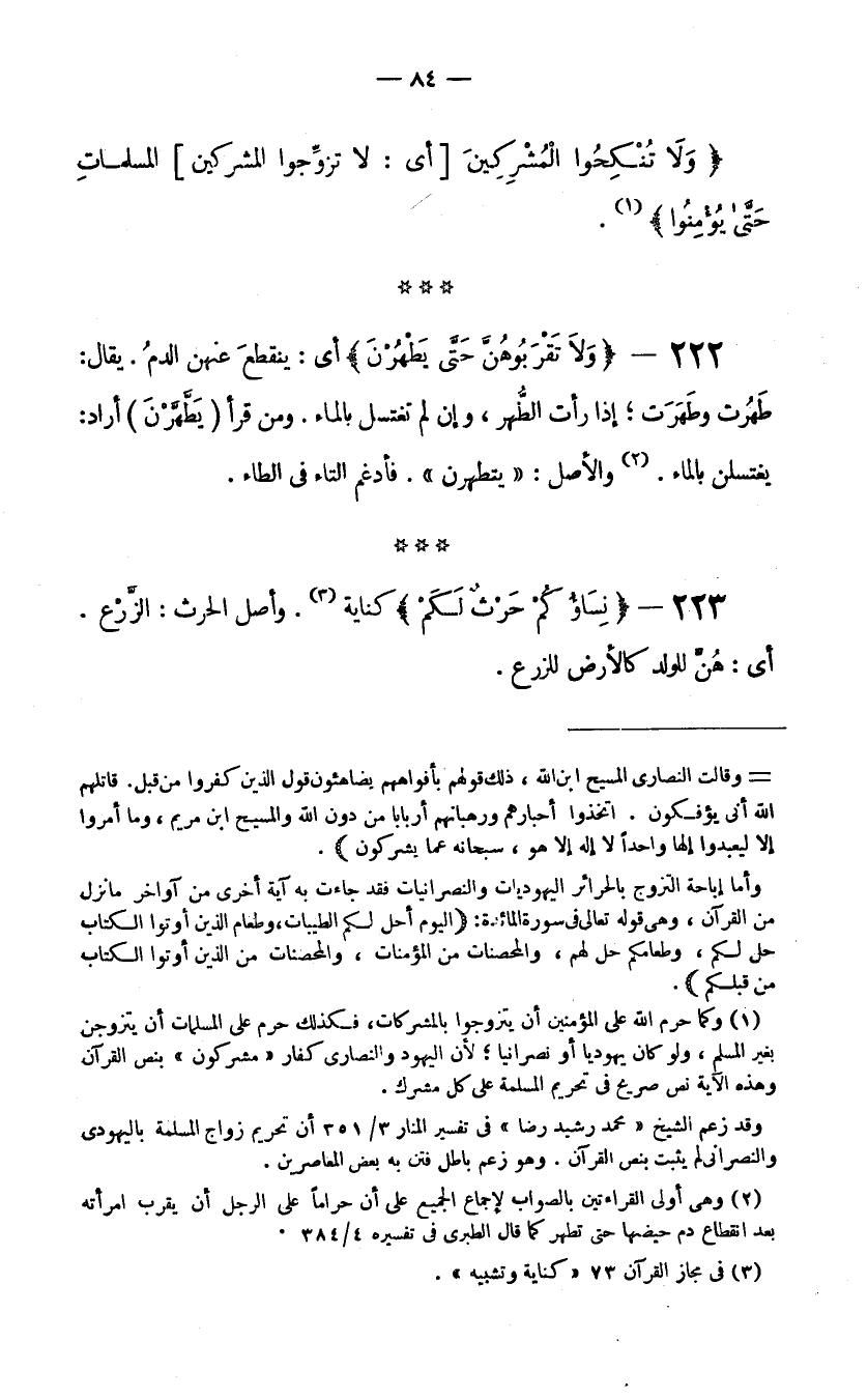 (1) وكما حرم الله المؤمنين أن يتزوجوا بالمشركات، فكذلك حرم على المسلمات أن يتزوجن بغير المسلم، ولو كان يهوديا أو نصرانيا؛ لأن اليهود والنصارى كفار "مشركون" بنص القرآن وهذه الآية نص صريح في تحريم المسلمة على كل مشرك. وقد زعم الشيخ "محمد رشيد رضا" في تفسير المنار 3/351 أن تحريم زواج المسلمة باليهودي والنصراني لم يثبت بنص القرآن. وهو زعم باطل فتن به بعض المعاصرين.