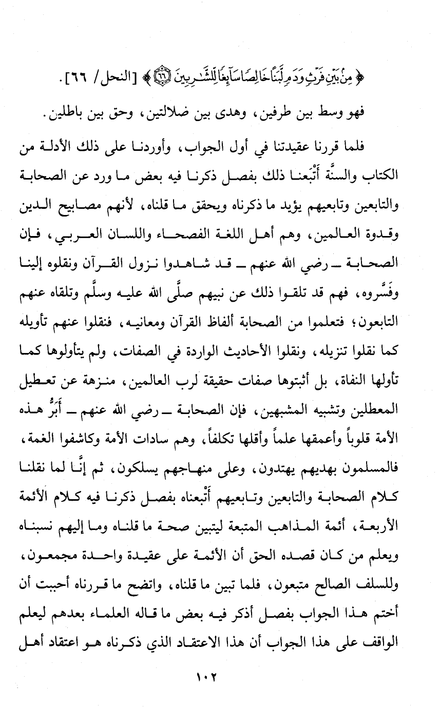 فلما قررنا عقيدتنا في أول الجواب، وأوردنا على ذلك الأدلة من الكتاب والسنة - أتبعنا ذلك بفصل ذكرنا فيه بعض ما ورد عن الصحابة والتابعين وتابعيهم، يؤيد ما ذكرناه، ويحقق ما قلناه؛ لأنهم مصابيح الدين وقدوة العالمين، وهم أهل اللغة الفصحاء واللسان العربي، فإن الصحابة رضي الله عنهم قد شاهدوا نزول القرآن ونقلوه إلينا وفسروه، فهم قد تلقوا ذلك عن نبيهم صلى الله عليه وسلم وتلقاه عنهم التابعون؛ فتعلموا من الصحابه ألفاظ القرآن ومعانيه، فنقلوا عنهم تأويله كما نقلوا تنزيله، ونقلوا الأحاديث الواردة في الصفات، ولم يتأولوها كما تأولها النفاه، بل أثبتوها صفات حقيقة لرب العالمين، منزهة عن تعطيل المعطلين وتشبيه المشبهين. فإن الصحابة رضي الله عنهم أبر هذه الأمة قلوبا وأعمقها علما وأقلها تكلفا، وهم سادات الأمة وكاشفو الغمة، فالمسلمون بهديهم يهتدون، وعلى منهاجهم يسلكون، ثم إنا لما نقلنا كلام الصحابة والتابعين وتابعيهم أتبعناه بفصل ذكرنا فيه كلام الأئمة الأربعة، أئمة المذاهب المتبعة؛ ليتبين صحة ما قلناه وما إليهم نسبناه، ويعلم من كان قصده الحق أن الأئمة على عقيدة واحدة مجمعون، وللسلف الصالح متبعون، فلما تبين ما قلناه، واتضح ما قررناه أحببت أن أختم هذا الجواب بفصل أذكر فيه بعض ما قاله العلماء بعدهم؛ ليعلم الواقف على هذا الجواب أن هذا الاعتقاد الذي ذكرناه هو اعتقاد أهل