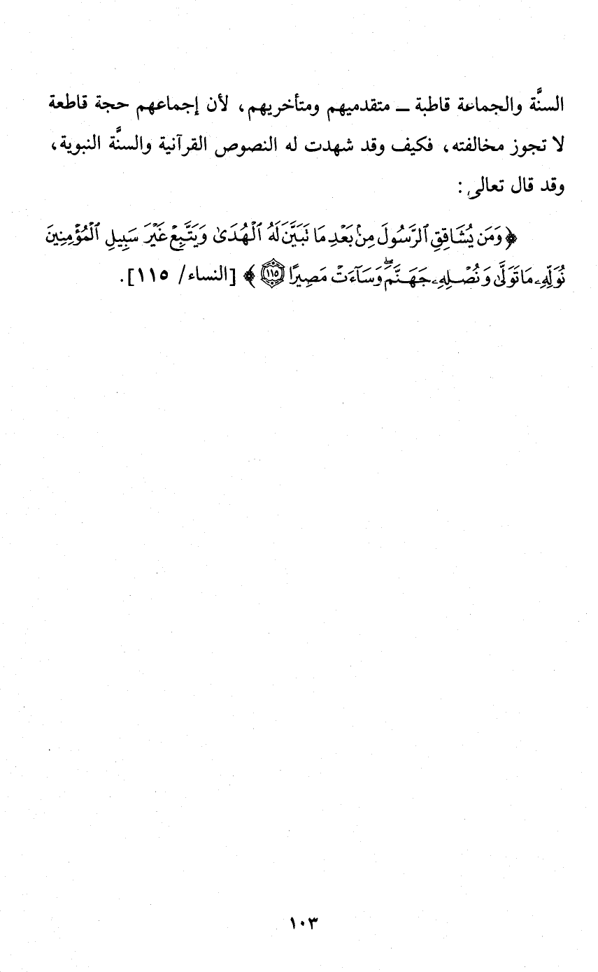 السنة والجماعة قاطبة متقدميهم ومتأخريهم؛ لأن إجماعهم حجة قاطعة لا تجوز مخالفته، فكيف وقد شهدت له النصوص القرآنية والسنة النبوية، وقد قال تعالى: {وَمَنْ يُشَاقِقِ الرَّسُولَ مِنْ بَعْدِ مَا تَبَيَّنَ لَهُ الْهُدَى وَيَتَّبِعْ غَيْرَ سَبِيلِ الْمُؤْمِنِينَ نُوَلِّهِ مَا تَوَلَّى وَنُصْلِهِ جَهَنَّمَ وَسَاءَتْ مَصِيرًا} [النساء: 115] .