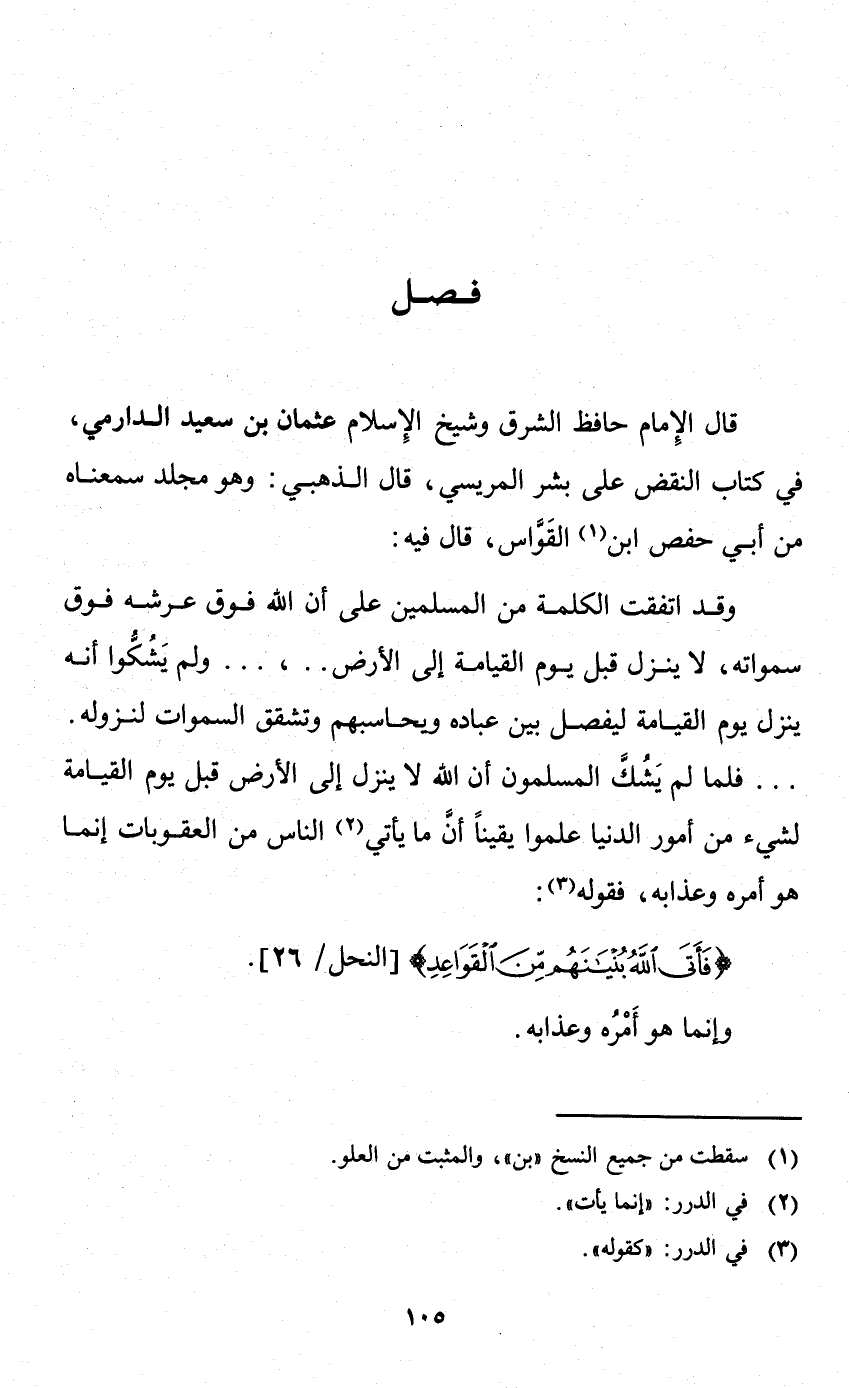 قال الإمام حافظ الشرق وشيخ الإسلام، عثمان بن سعيد الدارمي، في كتاب النقض على بشر المريسي -قال الذهبي: وهو مجلد سمعناه من أبي حفص بن القواس - قال فيه: