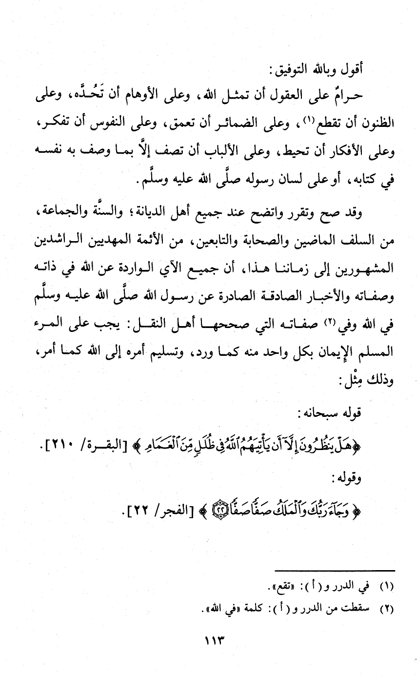 وقد صح وتقرر واتضح عند جميع أهل الديانة؛ والسنة والجماعة، من السلف الماضين والصحابة والتابعين، من الأئمة المهديين الراشدين المشهورين إلى زماننا هذا: أن جميع الآي الواردة عن الله في ذاته وصفاته، والأخبار الصادقة الصادرة عن رسول الله صلى الله عليه وسلم في الله وفي صفاته التي صححها أهل النقل - يجب على المرء المسلم الإيمان بكل واحد منه كما ورد، وتسليم أمره إلى الله كما أمر، وذلك مثل: قوله سبحانه: {هَلْ يَنْظُرُونَ إِلَّا أَنْ يَأْتِيَهُمُ اللَّهُ فِي ظُلَلٍ مِنَ الْغَمَامِ} [البقرة: 210] ، وقوله: {وَجَاءَ رَبُّكَ وَالْمَلَكُ صَفًّا صَفًّا} [الفجر: 22] ،
