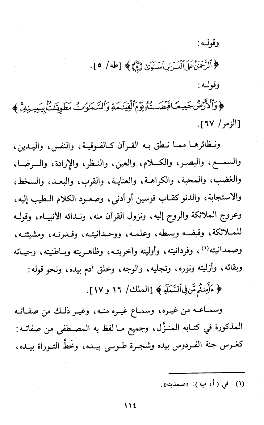 ونظائرها مما نطق به القرآن: كالفوقية، والنفس، واليدين، والسمع، والبصر، والكلام، والعين، والنظر، والإرادة، والرضا، والغضب، والمحبة، والكراهة، والعناية، والقرب، والبعد، والسخط، والاستجابة، والدنو كقاب قوسين أو أدنى، وصعود الكلام الطيب إليه، وعروج الملائكة والروح إليه، ونزول القرآن منه، وندائه الأنبياء، وقوله للملائكة، وقبضه وبسطه، وعلمه، ووحدانيته، وقدرته، ومشيئته، وصمدانيته، وفردانيته، وأوليته، وآخريته، وظاهريته، وباطنيته، وحياته، وبقائه، وأزليته، ونوره، وتجليه، والوجه، وخلق آدم بيده، ونحو قوله {أَأَمِنْتُمْ مَنْ فِي السَّمَاءِ} [الملك: 16 و 17] .