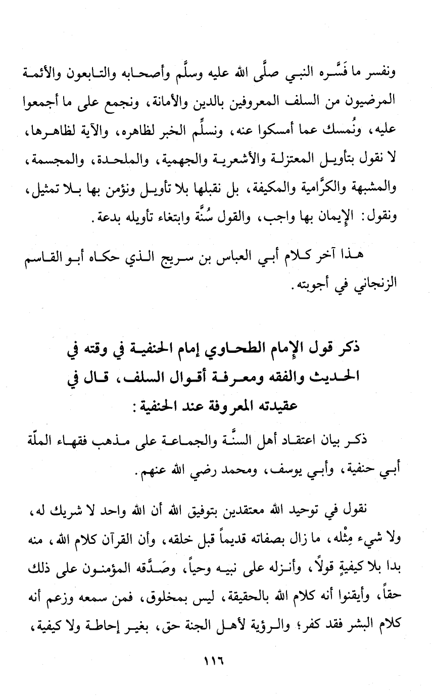 ذكر بيان اعتقاد أهل السنة والجماعة على مذهب فقهاء الملة: أبي حنفية، وأبي يوسف، ومحمد رضي الله عنهم.