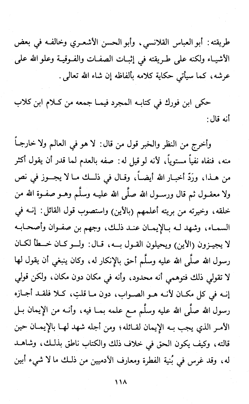 حكى ابن فورك في كتابه المجرد فيما جمعه من كلام ابن كلاب أنه قال: وأخرج من النظر والخبر قول من قال: لا هو في العالم ولا خارجا منه، فنفاه نفيا مستويا؛ لأنه لو قيل له: صفه بالعدم؛ لما قدر أن يقول أكثر من هذا، ورد أخبار الله أيضا، وقال في ذلك ما لا يجوز في نص ولا معقول.
