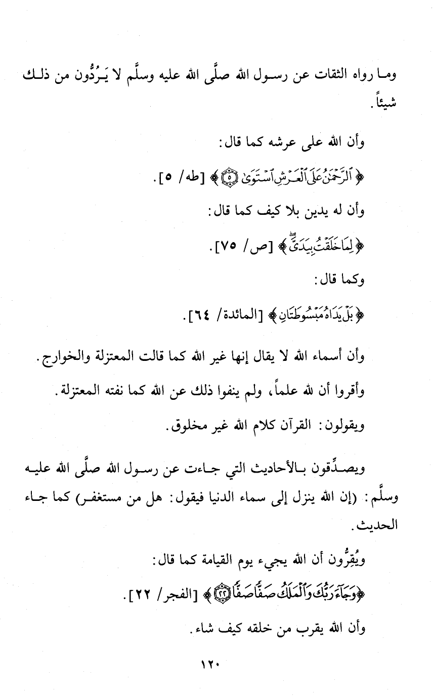 وما رواه الثقات عن رسول الله صلى الله عليه وسلم، لا يردون من ذلك شيئا، وأن الله على عرشه كما قال: {الرَّحْمَنُ عَلَى الْعَرْشِ اسْتَوَى} [طه: 5] ، وأن له يدين بلا كيف كما قال: {لِمَا خَلَقْتُ بِيَدَيَّ} [ص:75] ، وكما قال: {بَلْ يَدَاهُ مَبْسُوطَتَانِ} [المائدة: 64] .