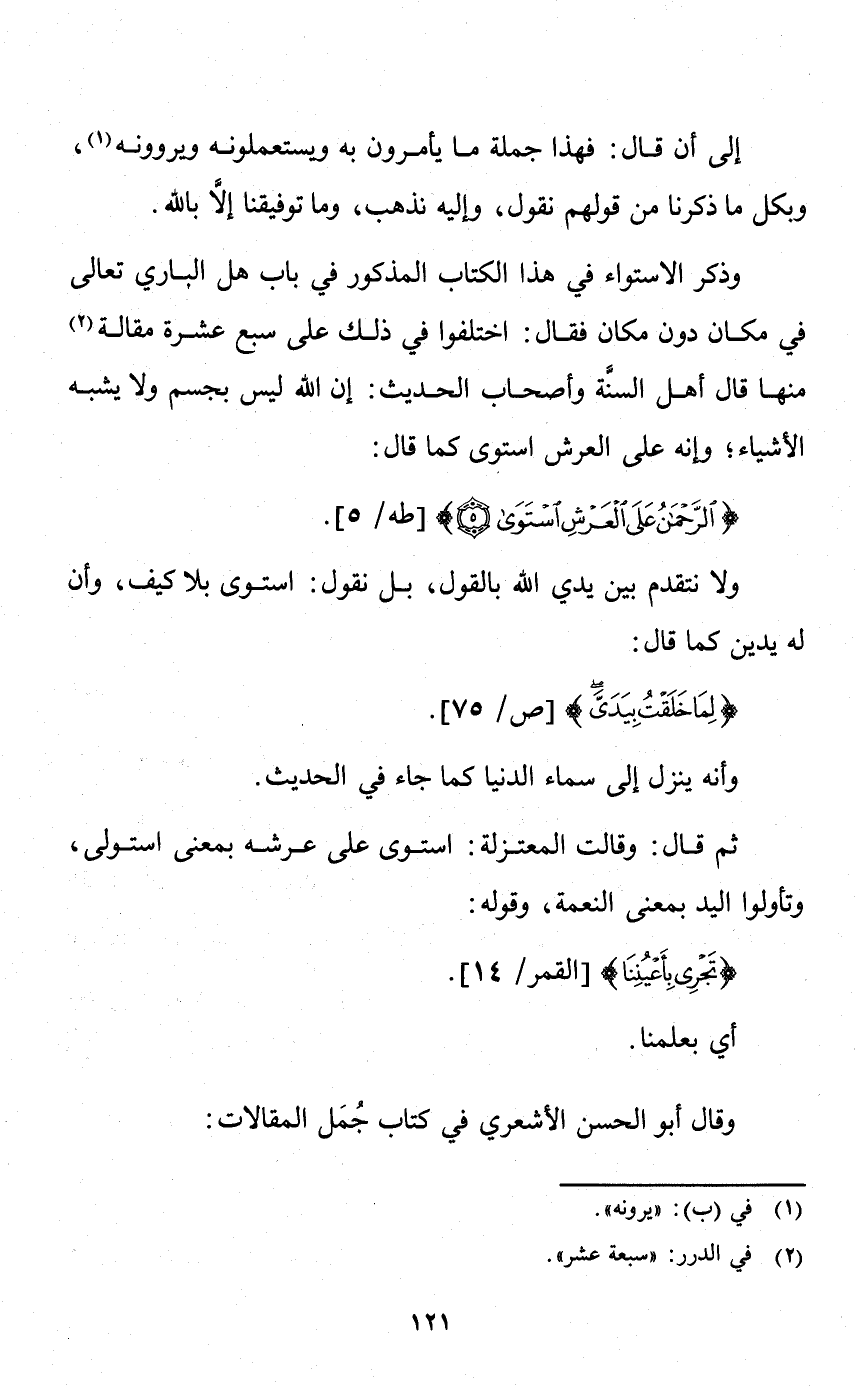 وذكر الاستواء في هذا الكتاب المذكور في باب هل الباري تعالى في مكان دون مكان فقال: اختلفوا في ذلك على سبع عشرة مقالة منها قال أهل السنة وأصحاب الحديث: إن الله ليس بجسم ولا يشبه الأشياء؛ وإنه على العرش استوى كما قال: {الرَّحْمَنُ عَلَى الْعَرْشِ اسْتَوَى} [طه: 5] ، ولا نتقدم بين يدي الله بالقول، بل نقول: استوى بلا كيف، وأن له يدين؛ كما قال: {لِمَا خَلَقْتُ بِيَدَيَّ} [ص: 75] ، وأنه ينزل إلى سماء الدنيا كما جاء في الحديث.