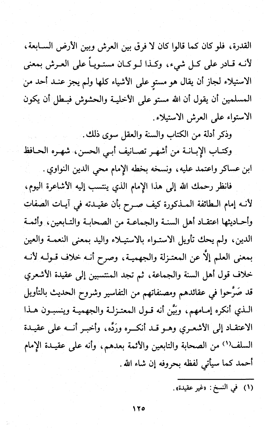 فانظر رحمك الله إلى هذا الإمام الذي ينتسب إليه الأشاعرة اليوم؛ لأنه إمام الطائفة المذكورة - كيف صرح بأن عقيدته في آيات الصفات وأحاديثها اعتقاد أهل السنة والجماعة من الصحابة والتابعين وأئمة الدين. ولم يحك تأويل الاستواء بالاستيلاء، واليد بمعنى النعمة، والعين بمعنى العلم إلا عن المعتزلة والجهمية. وصرح أنه خلاف قوله؛ لأنه خلاف قول أهل السنة والجماعة، ثم تجد المنتسبين إلى عقيدة الأشعري قد صرحوا في عقائدهم، ومصنفاتهم من التفاسير وشروح الحديث بالتأويل الذي أنكره إمامهم، وبين أنه قول المعتزلة والجهمية، وينسبون هذا الاعتقاد إلى الأشعري وهو قد أنكره ورده، وأخبر أنه على عقيدة السلف من الصحابة والتابعين والأئمة بعدهم، وأنه على عقيدة الإمام أحمد كما سيأتي لفظه بحروفه إن شاء الله.