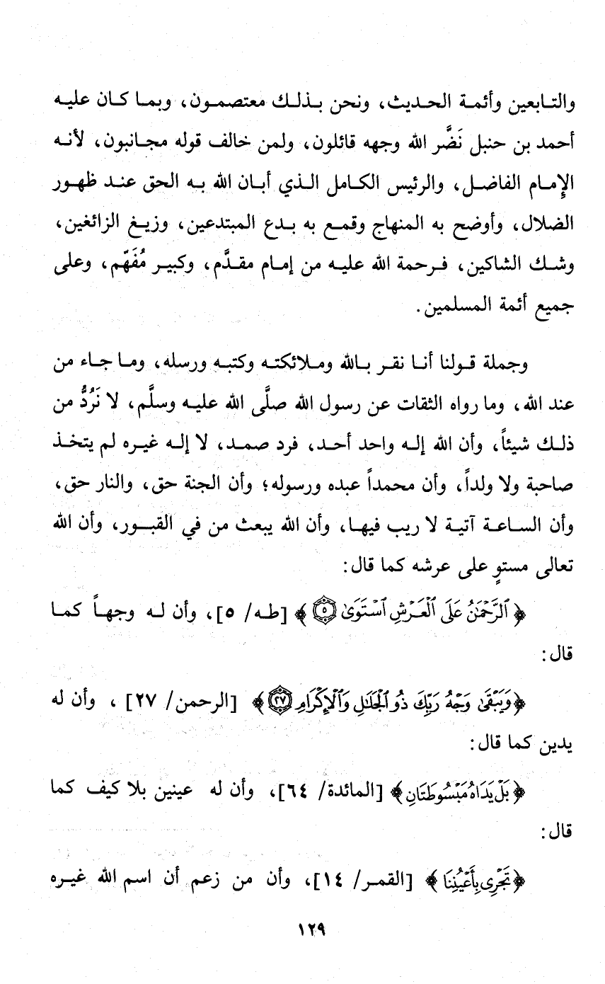 وجملة قولنا أنا نقر بالله وملائكته وكتبه ورسله، وما جاء من عند الله، وما رواه الثقات عن رسول الله صلى الله عليه وسلم، لا نرد من ذلك شيئا، وأن الله إله واحد أحد، فرد صمد، لا إله غيره، لم يتخذ صاحبة ولا ولدا، وأن محمدا عبده ورسوله؛ وأن الجنة حق، والنار حق، وأن الساعة آتية لا ريب فيها، وأن الله يبعث من في القبور، وأن الله تعالى مستو على عرشه كما قال: {الرَّحْمَنُ عَلَى الْعَرْشِ اسْتَوَى} [طه: 5] ، وأن له وجها كما قال: {وَيَبْقَى وَجْهُ رَبِّكَ ذُو الْجَلَالِ وَالْإِكْرَامِ} [الرحمن: 27] ، وأن له يدين كما قال: {بَلْ يَدَاهُ مَبْسُوطَتَانِ} [المائده: 64] ، وأن له عينين بلا كيف كما قال: {تَجْرِي بِأَعْيُنِنَا} [القمر: 14] ، وأن من زعم أن اسم الله غيره