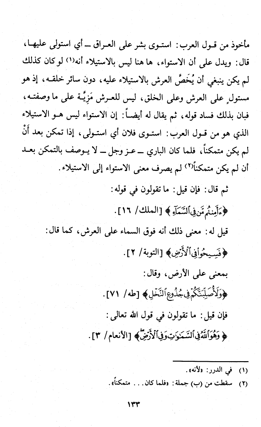 مأخوذ من قول العرب: استوى بشر على العراق أى استوى عليها، قال: ويدل على أن الاستواء هاهنا ليس بالاستيلاء أنه لو كان كذلك لم يكن ينبغي أن يخص العرش بالاستيلاء عليه، دون سائر خلقه، إذ هو مستول على العرش وعلى الخلق، ليس للعرش مزية على ما وصفته، فبان بذلك فساد قوله، ثم يقال له أيضا: إن الاستواء ليس هو الاستيلاء الذي هو من قول العرب: استوى فلان أى استولى، إذا تمكن بعد أن لم يكن متمكنا. فلما كان الباري عز وجل لا يوصف بالتمكن بعد أن لم يكن متمكنا لم يصرف معنى الاستواء إلى الاستيلاء.