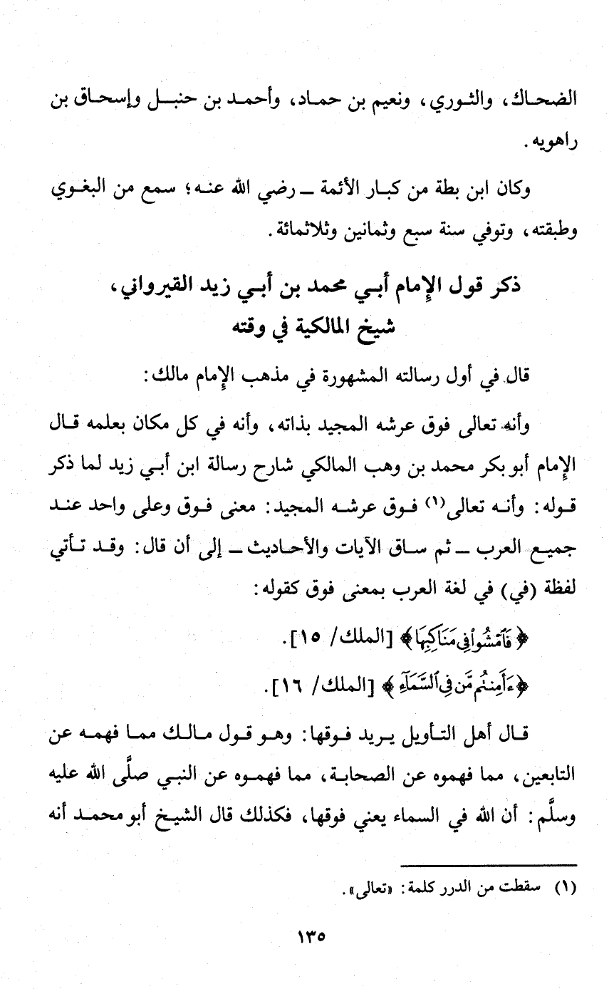 وأنه تعالى فوق عرشه المجيد بذاته، وأنه في كل مكان بعلمه. قال الإمام أبو بكر محمد بن وهب المالكي شارح رسالة ابن أبي زيد لما ذكر قوله "وأنه تعالى فوق عرشه المجيد": معنى "فوق" و"على" واحد عند جميع العرب، ثم ساق الآيات والأحاديث، إلى أن قال: وقد تأتي لفظة "في" في لغة العرب بمعنى "فوق"؛ كقوله: {فَامْشُوا فِي مَنَاكِبِهَا} [الملك: 15] ، {أَأَمِنْتُمْ مَنْ فِي السَّمَاءِ} [الملك: 16] .