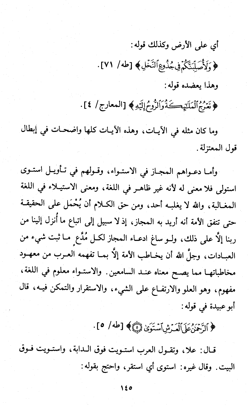 وأما دعواهم المجاز في الاستواء، وقولهم في تأويل "استوى" استولى فلا معنى له؛ لأنه غير ظاهر في اللغة، ومعنى الاستيلاء في اللغة المغالبة، والله لا يغلبه أحد، ومن حق الكلام أن يحمل على الحقيقة حتى تتفق الأمة أنه أريد به المجاز، إذ لا سبيل إلى اتباع ما أنزل إلينا من ربنا إلا على ذلك، ولو ساغ ادعاء المجاز لكل مدع ما ثبت شيء من العبادات، وجل الله أن يخاطب الأمة إلا بما تفهمه العرب من معهود مخاطباتها مما يصح معناه عند السامعين. والاستواء معلوم في اللغة مفهوم، وهو العلو والارتفاع على الشيء والاستقرار والتمكن فيه.