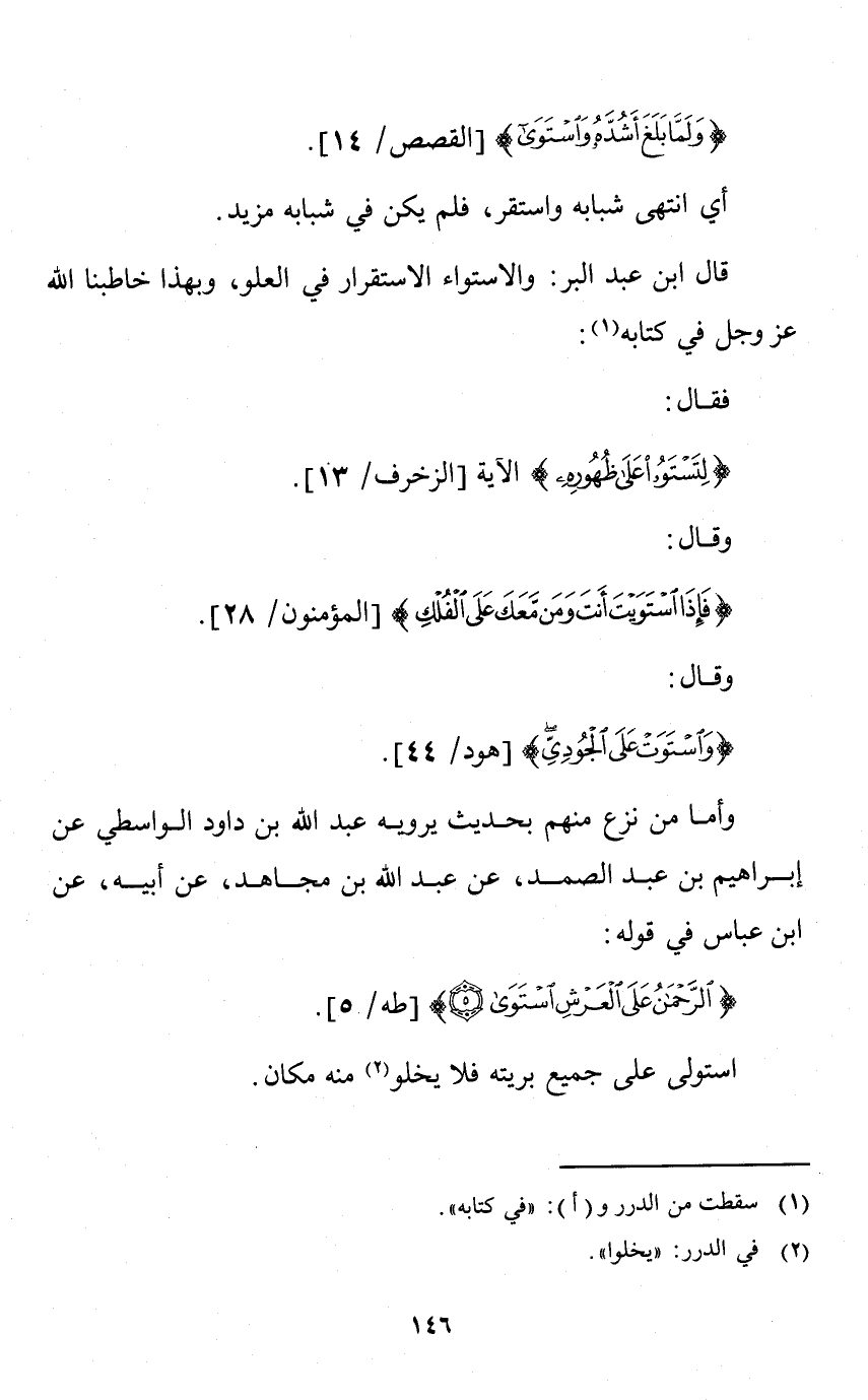 قال ابن عبد البر: والاستواء الاستقرار في العلو، وبهذا خاطبنا الله عز وجل في كتابه، فقال: {لِتَسْتَوُوا عَلَى ظُهُورِهِ} الآية [الزخرف: 13] ، وقال: {فَإِذَا اسْتَوَيْتَ أَنْتَ وَمَنْ مَعَكَ عَلَى الْفُلْكِ} [المؤمنون: 28] ، وقال: {وَاسْتَوَتْ عَلَى الْجُودِيِّ} [هود: 44] .