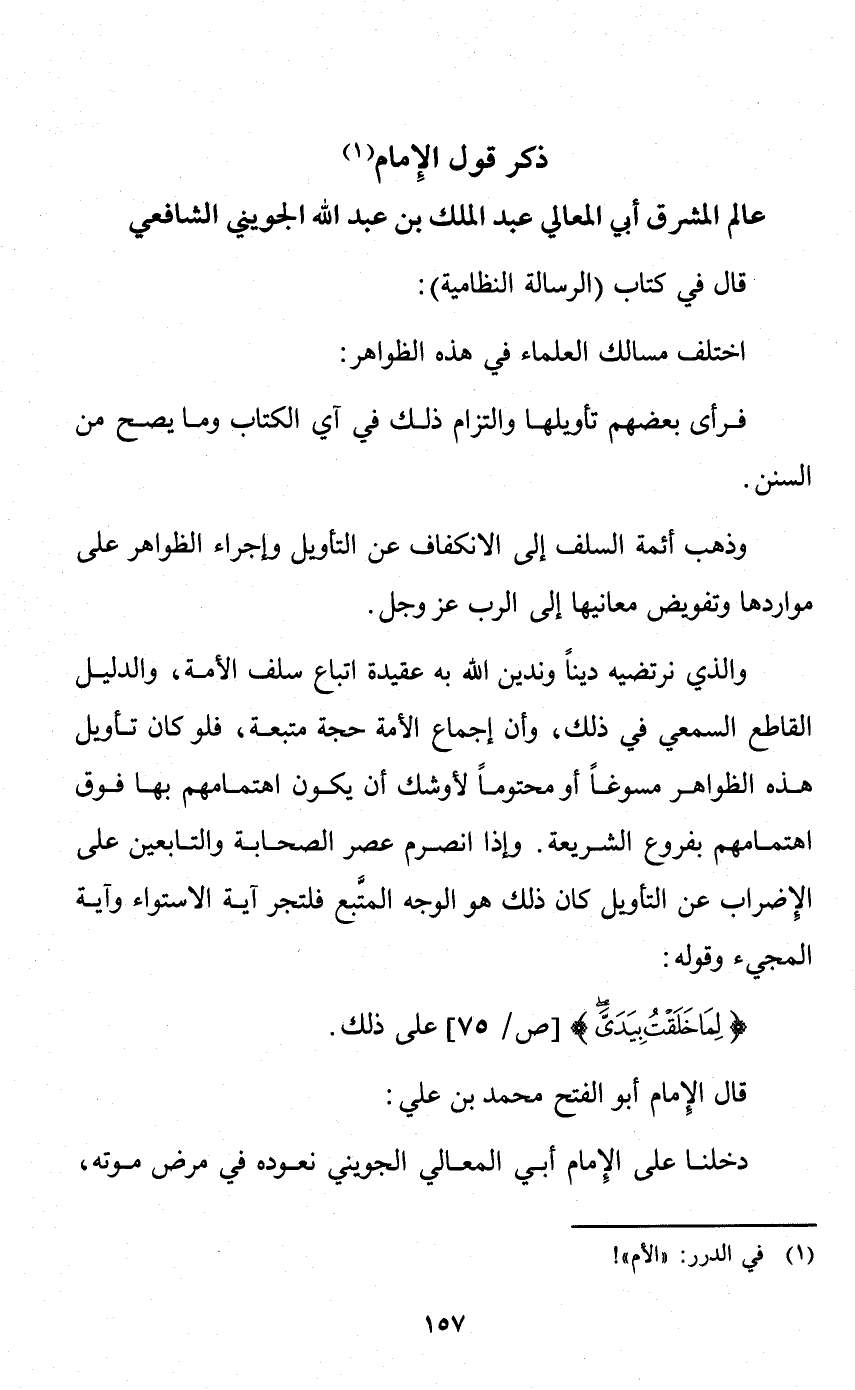 والذي نرتضيه دينا، وندين الله به - عقيدة اتباع سلف الأمة، والدليل القاطع السمعي في ذلك، وأن إجماع الأمة حجة متبعة. فلو كان تأويل هذه الظواهر مسوغا أو محتوما لأوشك أن يكون اهتمامهم بها فوق اهتمامهم بفروع الشريعة.