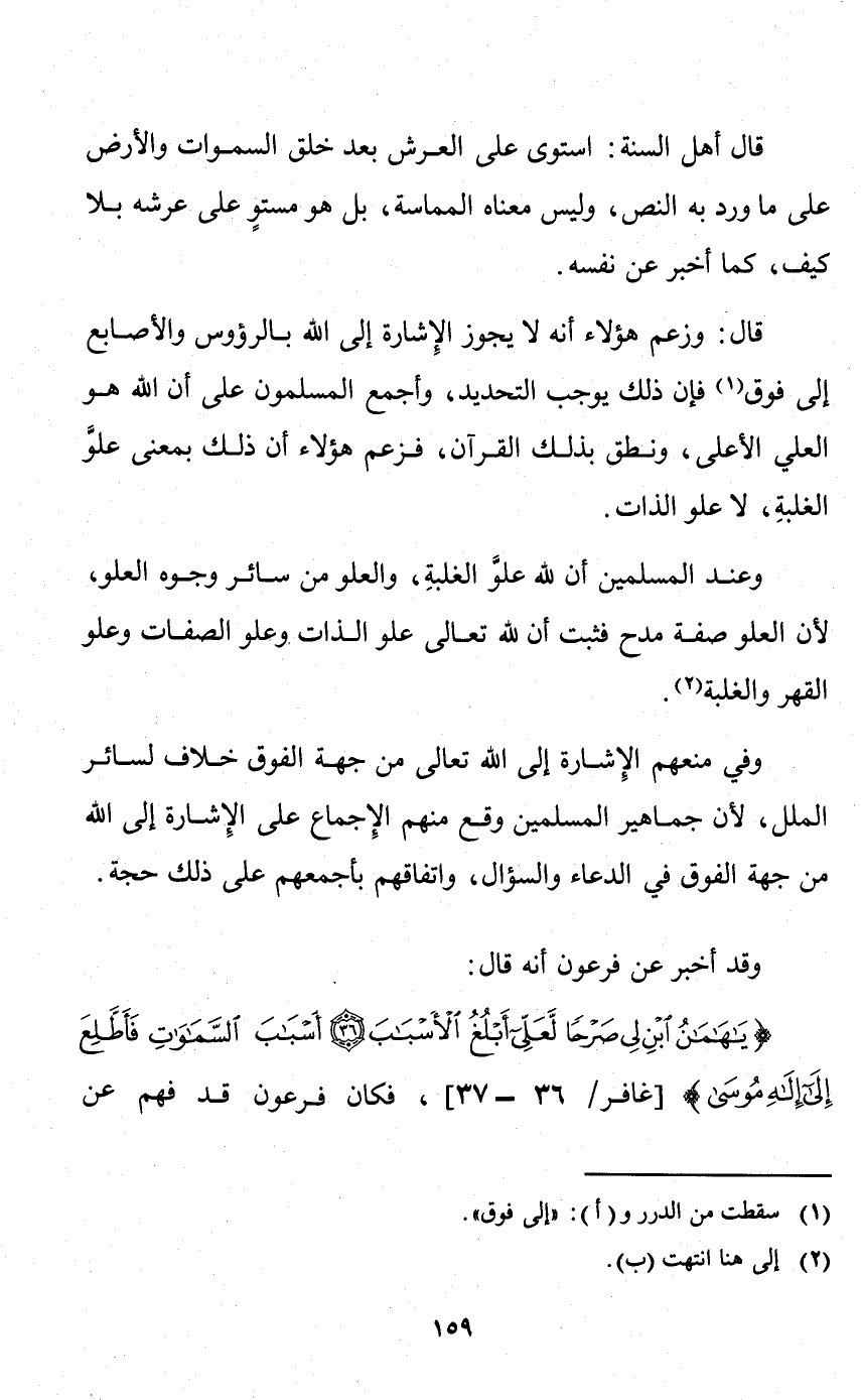 قال: وزعم هؤلاء أنه لا يجوز الإشارة إلى الله بالرءوس والأصابع إلى فوق، فإن ذلك يوجب التحديد، وأجمع المسلمون على أن الله هو العلي الأعلى، ونطق بذلك القرآن، فزعم هؤلاء أن ذلك بمعنى علو الغلبة، لا علو الذات.