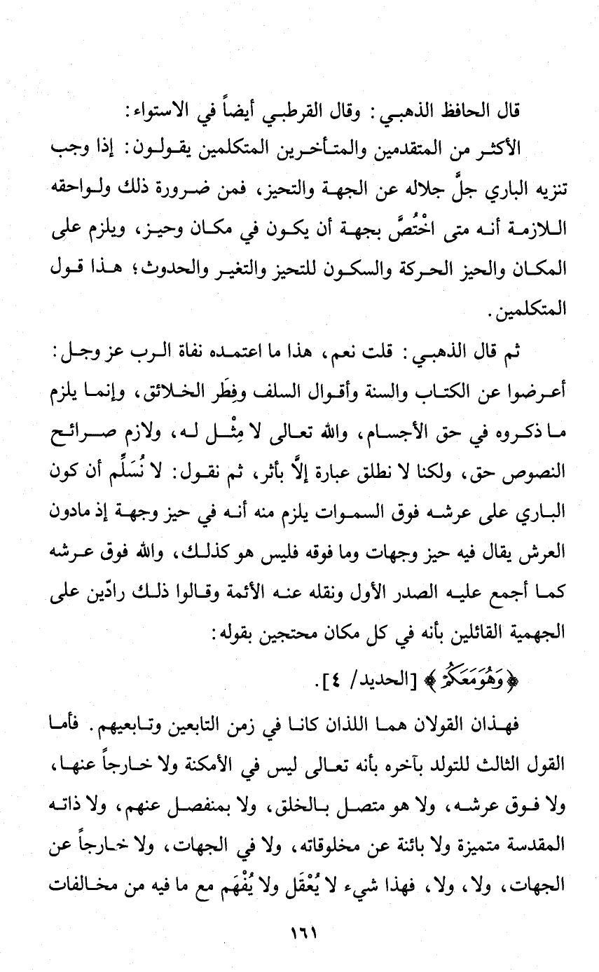 قال الحافظ الذهبي: وقال القرطبي أيضا في الاستواء: الأكثر من المتقدمين والمتأخرين المتكلمين، يقولون: إذا وجب تنزيه الباري جل جلاله عن الجهة والتحيز، فمن ضرورة ذلك ولواحقه اللازمة أنه متى اختص بجهة أن يكون في مكان وحيز، ويلزم على المكان والحيز الحركة والسكون للتحيز والتغير والحدوث. هذا قول المتكلمين.