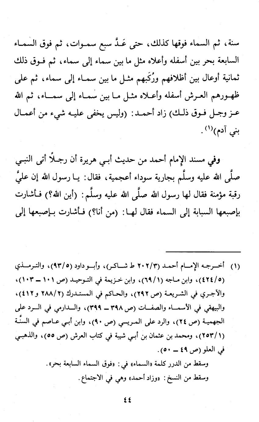 وفي مسند الإمام أحمد من حديث أبي هريرة «أن رجلا أتى النبي صلى الله عليه وسلم بجارية سوداء أعجمية، فقال: يا رسول الله، إن علي رقبة مؤمنة، فقال لها رسول الله صلى الله عليه وسلم: "أين الله؟ " فأشارت بأصبعها السبابة إلى السماء، فقال لها: "من أنا؟ " فأشارت بأصبعها إلى»