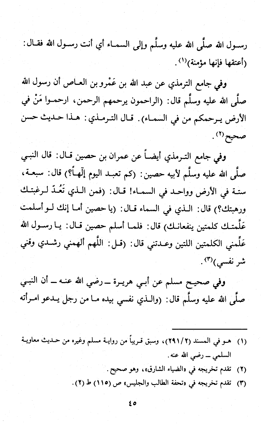 وفي جامع الترمذي أيضا «عن عمران بن حصين، قال: قال النبي صلى الله عليه وسلم لأبيه حصين: "كم تعبد اليوم إلها؟ "، قال: سبعة: ستة في الأرض، وواحد في السماء، قال: "فمن الذي تعد لرغبتك ورهبتك؟ "، قال: الذي في السماء، قال: "يا حصين، أما إنك لو أسلمت علمتك كلمتين ينفعانك"، قال: فلما أسلم حصين، قال: يا رسول الله علمني الكلمتين اللتين وعدتني، قال: "قل: اللهم ألهمني رشدي وقني شر نفسي» .