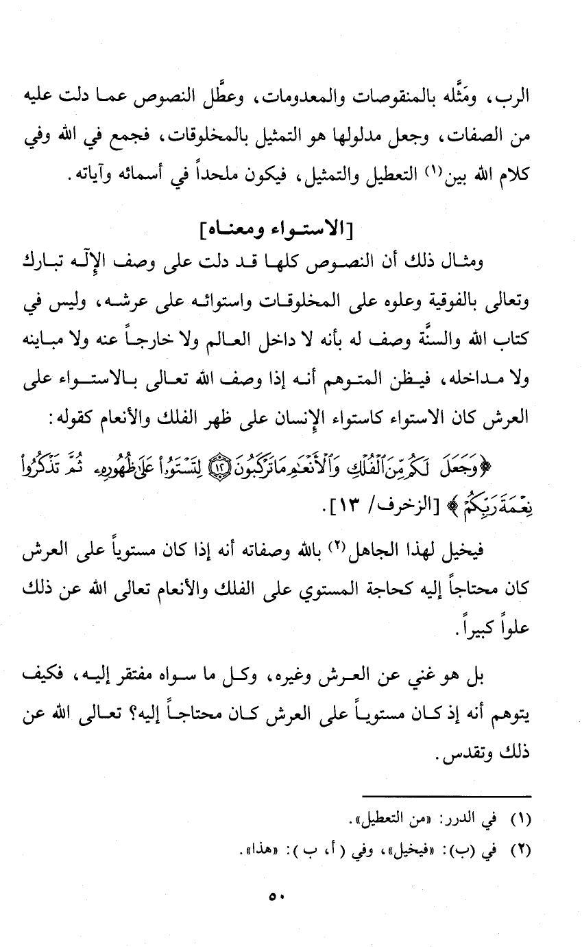 ومثال ذلك أن النصوص كلها قد دلت على وصف الإله -تبارك وتعالى- بالفوقية وعلوه على المخلوقات واستوائه على عرشه، وليس في كتاب الله والسنة وصف له بأنه لا داخل العالم ولا خارجا عنه ولا مباينه ولا مداخله، فيظن المتوهم أنه إذا وصف الله تعالى بالاستواء على العرش كان الاستواء كاستواء الإنسان على ظهر الفلك والأنعام؛ كقوله: {وَجَعَلَ لَكُمْ مِنَ الْفُلْكِ وَالْأَنْعَامِ مَا تَرْكَبُونَ لِتَسْتَوُوا عَلَى ظُهُورِهِ ثُمَّ تَذْكُرُوا نِعْمَةَ رَبِّكُمْ} [الزخرف: 12، 13] . فيخيل لهذا الجاهل بالله وصفاته أنه إذا كان مستويا على العرش كان محتاجا إليه كحاجة المستوي على الفلك والأنعام، تعالى الله عن ذلك علوا كبيرا.