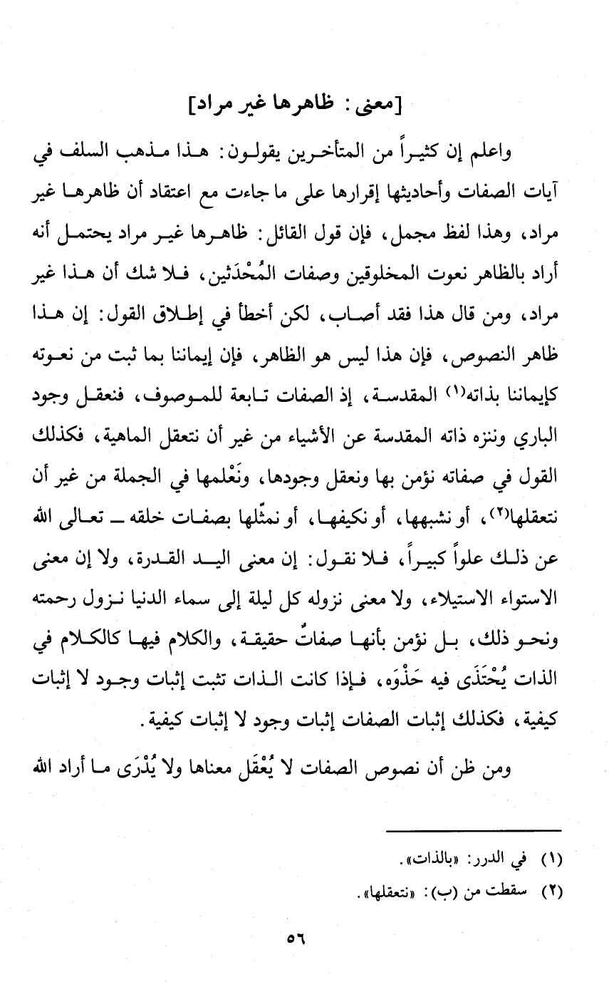 واعلم أن كثيرا من المتأخرين يقولون: هذا مذهب السلف في آيات الصفات وأحاديثها: إقرارها على ما جاءت مع اعتقاد أن ظاهرها غير مراد. وهذا لفظ مجمل، فإن قول القائل: ظاهرها غير مراد يحتمل أنه أراد بالظاهر نعوت المخلوقين وصفات المحدثين. فلا شك أن هذا غير مراد. ومن قال هذا فقد أصاب، لكن أخطأ في إطلاق القول: إن هذا ظاهر النصوص، فإن هذا ليس هو الظاهر، فإن إيماننا بما ثبت من نعوته كإيماننا بذاته المقدسة؛ إذ الصفات تابعة للموصوف، فنعقل وجود الباري وننزه ذاته المقدسة عن الأشياء من غير أن نتعقل الماهية، فكذلك القول في صفاته، نؤمن بها ونعقل وجودها، ونعلمها في الجملة من غير أن نتعقلها، أو نشبهها، أو نكيفها، أو نمثلها بصفات خلقه، تعالى الله عن ذلك علوا كبيرا، فلا نقول: إن معنى اليد القدرة، ولا إن معنى الاستواء الاستيلاء، ولا معنى نزوله كل ليلة إلى سماء الدنيا نزول رحمته ونحو ذلك، بل نؤمن بأنها صفات حقيقة، والكلام فيها كالكلام في الذات يحتذى فيه حذوه، فإذا كانت الذات تثبت إثبات وجود لا إثبات كيفية، فكذلك إثبات الصفات إثبات وجود لا إثبات كيفية.