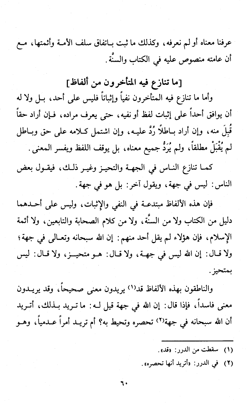 والناطقون بهذه الألفاظ قد يريدون معنى صحيحا، وقد يريدون معنى فاسدا، فإذا قال: إن الله في جهة، قيل له: ما تريد بذلك؟ أتريد أن الله سبحانه في جهة تحصره وتحيط به؟ أم تريد أمرا عدميا، وهو