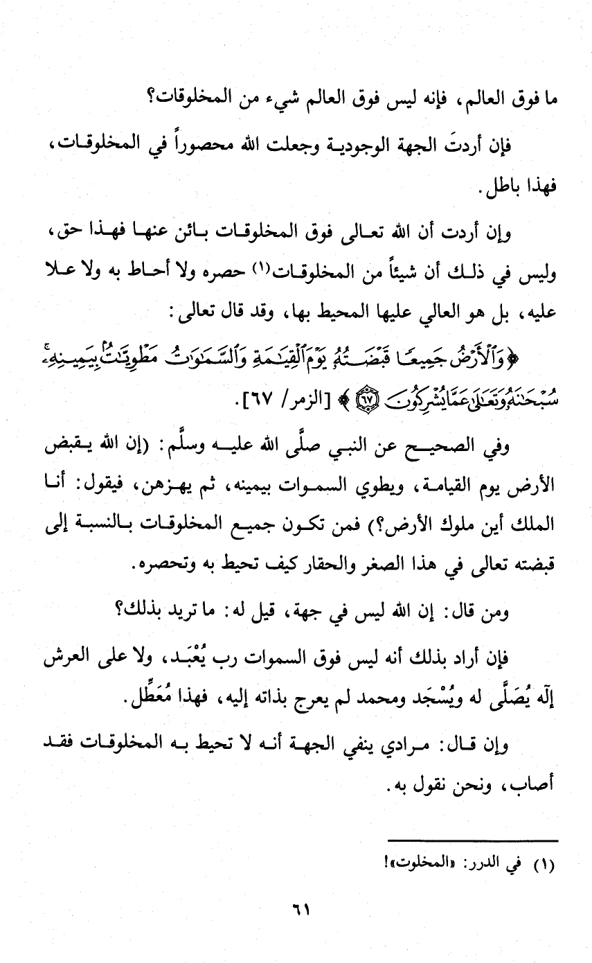وإن أردت أن الله تعالى فوق المخلوقات بائن عنها فهذا حق، وليس في ذلك أن شيئا من المخلوقات حصره ولا أحاط به ولا علا عليه، بل هو العالي عليها المحيط بها، وقد قال تعالى: {وَالْأَرْضُ جَمِيعًا قَبْضَتُهُ يَوْمَ الْقِيَامَةِ وَالسَّماوَاتُ مَطْوِيَّاتٌ بِيَمِينِهِ سُبْحَانَهُ وَتَعَالَى عَمَّا يُشْرِكُونَ} [الزمر: 67] .