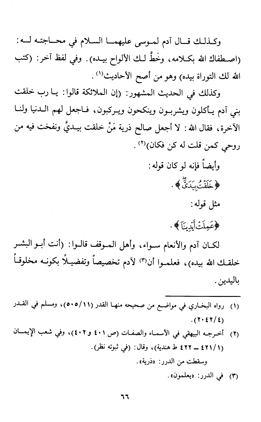 وكذلك «قال آدم لموسى -عليهما السلام- في محاجته له: (اصطفاك الله بكلامه، وخط لك الألواح بيده» ) . وفي لفظ آخر: ( «كتب الله لك التوراة بيده» ) وهو من أصح الأحاديث.