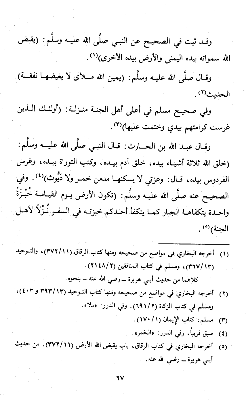وقال عبد الله بن الحارث: قال النبي صلى الله عليه وسلم: «خلق الله ثلاثة أشياء بيده: خلق آدم بيده، وكتب التوراة بيده، وغرس الفردوس بيده، قال: وعزتي لا يسكنها مدمن خمر ولا ديوث» . وفي الصحيح عنه صلى الله عليها وسلم: «تكون الأرض يوم القيامة خبزة واحدة، يتكفأها الجبار كما يتكفأ أحدكم خبزته في السفر؛ نزلا لأهل الجنة» .