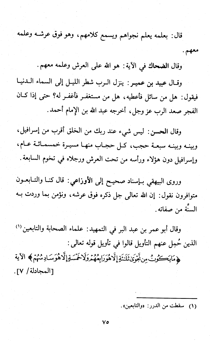 وقال أبو عمر بن عبد البر في التمهيد: علماء الصحابة والتابعين الذين حمل عنهم التأويل قالوا في تأويل قوله تعالى: {مَا يَكُونُ مِنْ نَجْوَى ثَلَاثَةٍ إِلَّا هُوَ رَابِعُهُمْ وَلَا خَمْسَةٍ إِلَّا هُوَ سَادِسُهُمْ} الآية [المجادلة: 7]