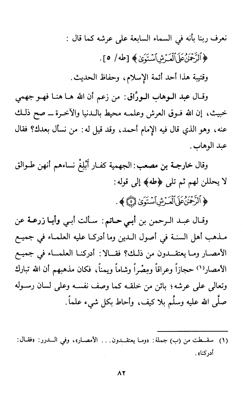 وقال عبد الرحمن بن أبي حاتم: سألت أبي وأبا زرعة عن مذهب أهل السنة في أصول الدين وما أدركا عليه العلماء في جميع الأمصار وما يعتقدون من ذلك؟ فقالا: أدركنا العلماء في جميع الأمصار حجازا وعراقا ومصرا وشاما ويمنا، فكان مذهبهم أن الله تبارك وتعالى على عرشه؛ بائن من خلقه؛ كما وصف نفسه وعلى لسان رسوله صلى الله عليه وسلم بلا كيف، وأحاط بكل شيء علما.