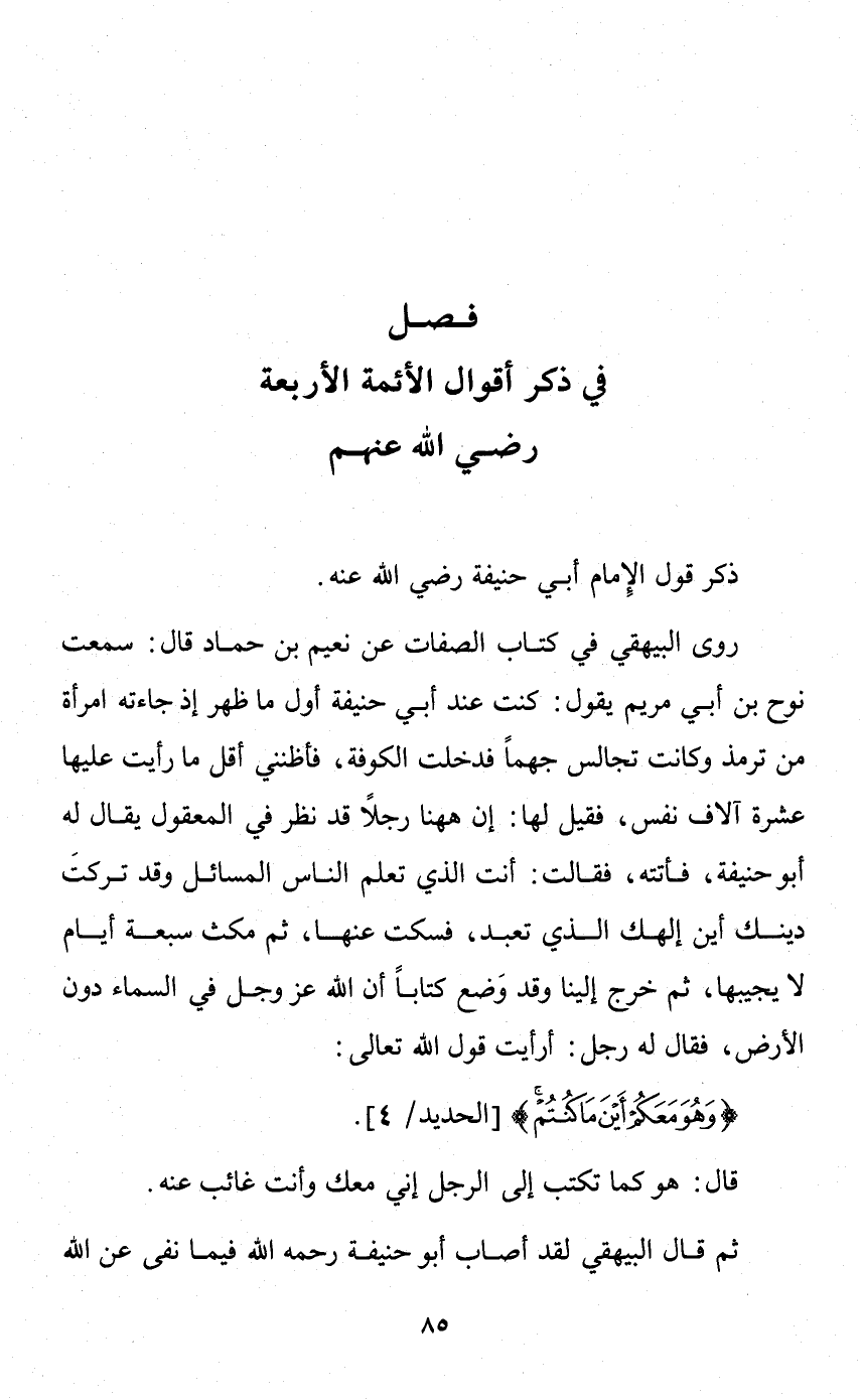 روى البيهقي في كتاب الصفات عن نعيم بن حماد، قال: سمعت نوح بن أبي مريم، يقول: كنت عند أبي حنيفة أول ما ظهر؛ إذ جاءته امرأة من ترمذ، وكانت تجالس جهما، فدخلت الكوفة، فأظنني أقل ما رأيت عليها عشرة آلاف نفس، فقيل لها: إن هاهنا رجلا قد نظر في المعقول يقال له أبو حنيفة، فأتته، فقالت: أنت الذي تعلم الناس المسائل، وقد تركت دينك، أين إلهك الذي تعبد؟ فسكت عنها، ثم مكث سبعة أيام لا يجيبها، ثم خرج إلينا، وقد وضع كتابا: أن الله عز وجل في السماء دون الأرض، فقال له رجل: أرأيت قول الله تعالى: {وَهُوَ مَعَكُمْ أَيْنَ مَا كُنْتُمْ} [الحديد: 4] .