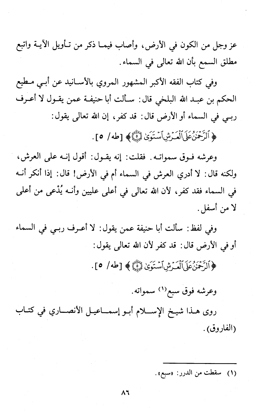وفي كتاب الفقه الأكبر المشهور المروي بالأسانيد عن أبي مطيع الحكم بن عبد الله البلخي، قال: سألت أبا حنيفة عمن يقول لا أعرف ربي في السماء أو الأرض؟ قال: قد كفر، إن الله تعالى يقول: {الرَّحْمَنُ عَلَى الْعَرْشِ اسْتَوَى} [طه: 5] ، وعرشه فوق سماواته. فقلت: إنه يقول: أقول إنه على العرش، ولكنه قال: لا أدري العرش في السماء أم في الأرض! قال: إذا أنكر أنه في السماء فقد كفر؛ لأن الله تعالى في أعلى عليين، وأنه يدعى من أعلى لا من أسفل.