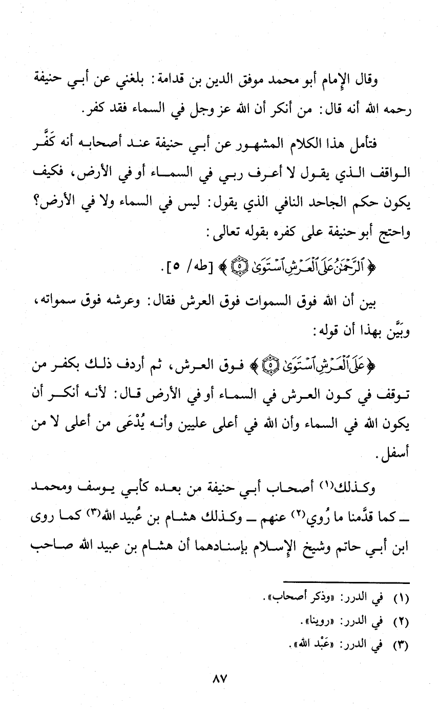 وقال الإمام أبو محمد موفق الدين بن قدامة: بلغني عن أبي حنيفة رحمه الله أنه قال: من أنكر أن الله عز وجل في السماء فقد كفر.