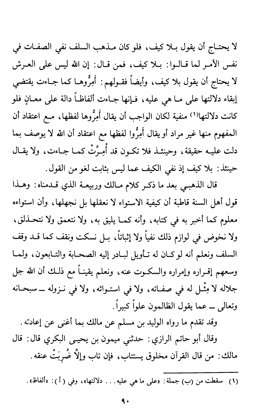 لا يحتاج أن يقول بلا كيف، فلو كان مذهب السلف نفي الصفات في نفس الأمر؛ لما قالوا: بلا كيف، فمن قال: إن الله ليس على العرش لا يحتاج أن يقول بلا كيف.