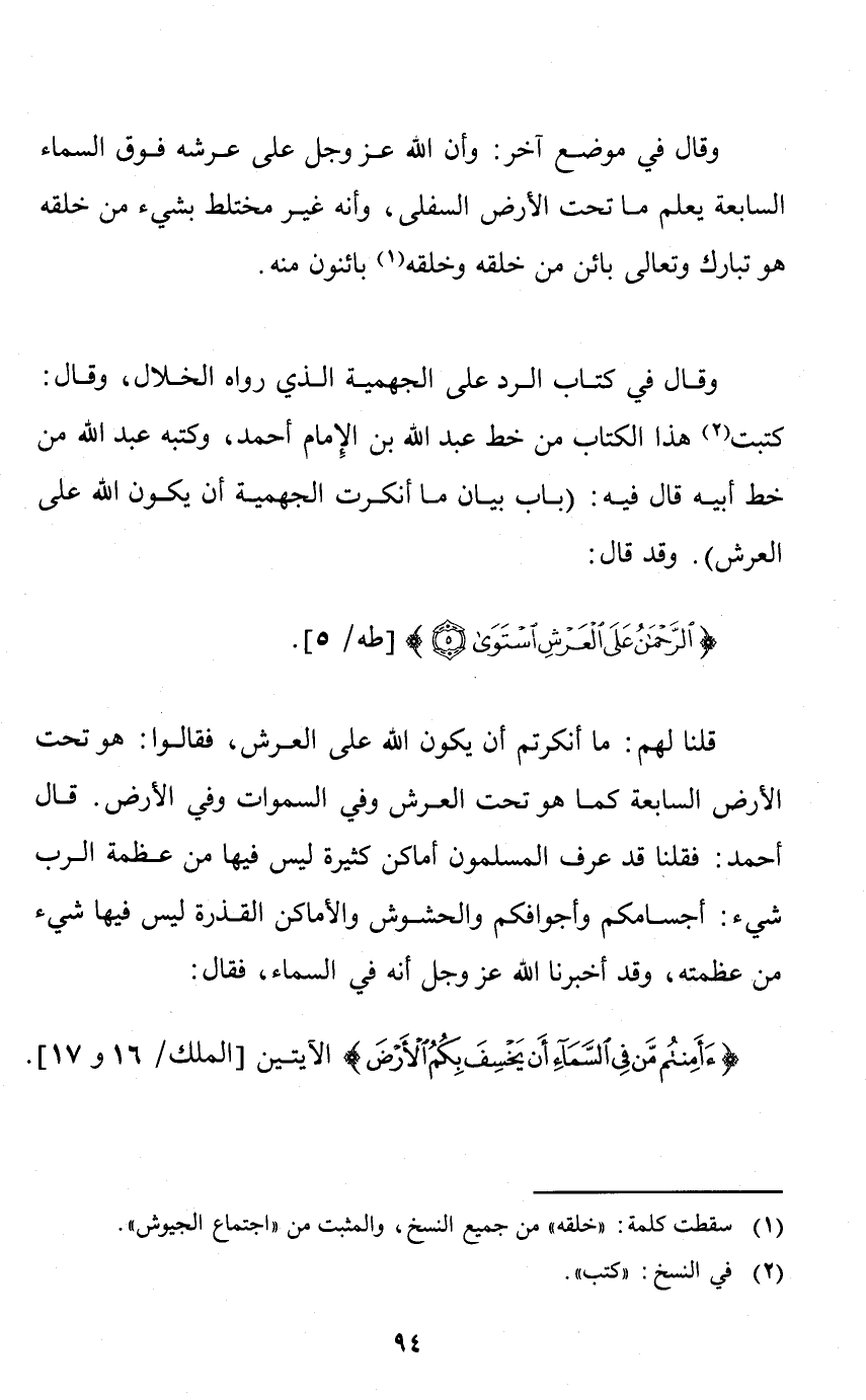 وقال في كتاب الرد على الجهمية الذي رواه الخلال، وقال: كتبت هذا الكتاب من خط عبد الله ابن الإمام أحمد، وكتبه عبد الله من خط أبيه، قال فيه: (باب بيان ما أنكرت الجهمية أن يكون الله على العرش) ، وقد قال: {الرَّحْمَنُ عَلَى الْعَرْشِ اسْتَوَى} [طه: 5] ؟