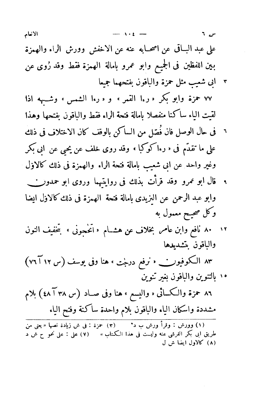 على عبد الْبَاقِي عَن اصحابه عَنهُ عَن الْأَخْفَش وورش الرَّاء والهمزة بَين اللَّفْظَيْنِ فِي الْجَمِيع وابو عَمْرو بامالة الْهمزَة فَقَط وَقد رُوِيَ عَن ابي شُعَيْب مثل حَمْزَة وَالْبَاقُونَ بفتحهما جَمِيعًا